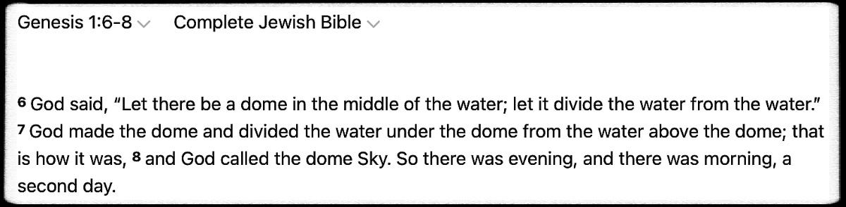 “And God said, ‘Let there be a firmament in the midst of the waters, and let it divide the waters from the waters.’ And God made the firmament, and divided the waters which were under the firmament from the waters which were above the firmament: and it was so. And God called the firmament Heaven. And the evening and the morning were the second day.”